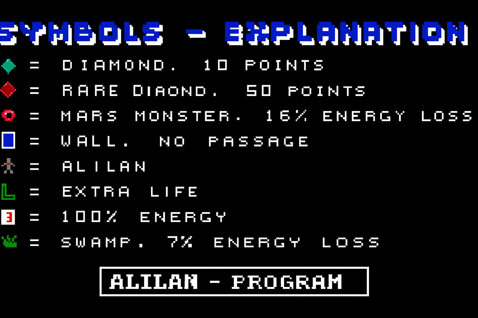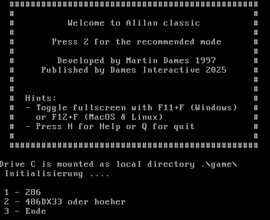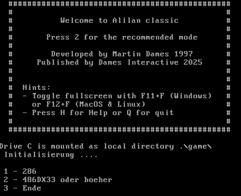 Alilan ist ein kleines, handgemachtes Retro-Spiel aus der DOS-Ära – gezeichnet, programmiert und zurechtgebastelt im Jahr 1997. Der Look ist purer C64-Flair: direkt, bunt, schnell und ein bisschen chaotisch.